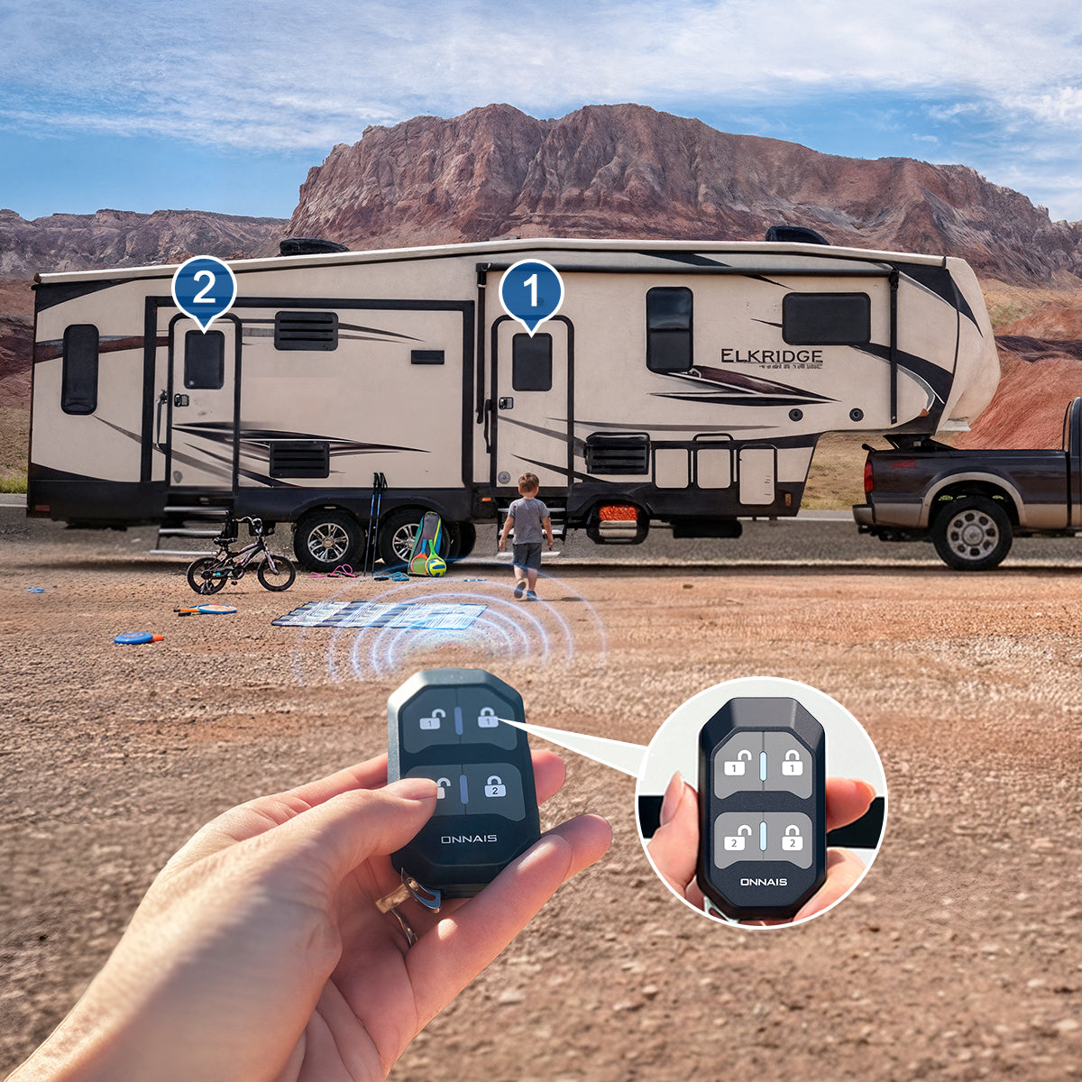 Control both your front and rear RV doors with a single fob, so you no longer need to juggle multiple remotes. Over 100 ft Extended Range Reliable signal that works through obstacles and at distances over 100 feet, so you can lock or unlock your RV from across the campsite.